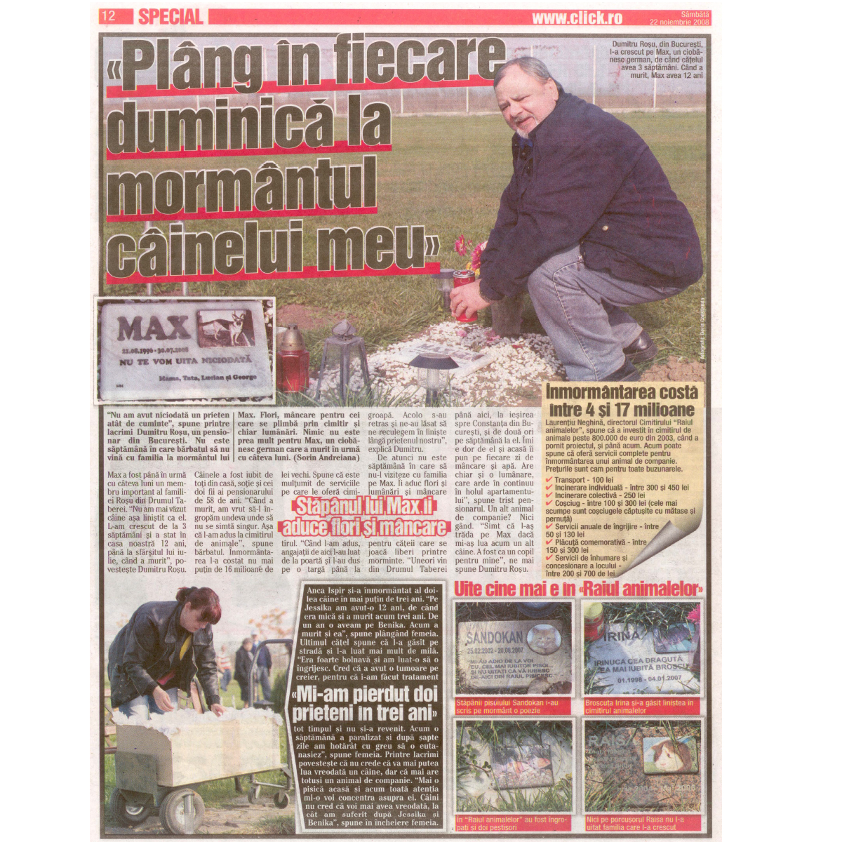 "Nu am avut niciodata un prieten atat de cuminte" spune printre lacrimi Dumitru Rosu, un pensionar din Bucuresti. Nu este saptamana in care barbatul sa nu vina cu familia la mormantul lui Max. Flori, mancare pentru cei care se plimba prin cimitir si chiar lumanari. Nimic nu este prea mult pentru Max, un ciobanesc german care a mutir in urma cu cateva luni...