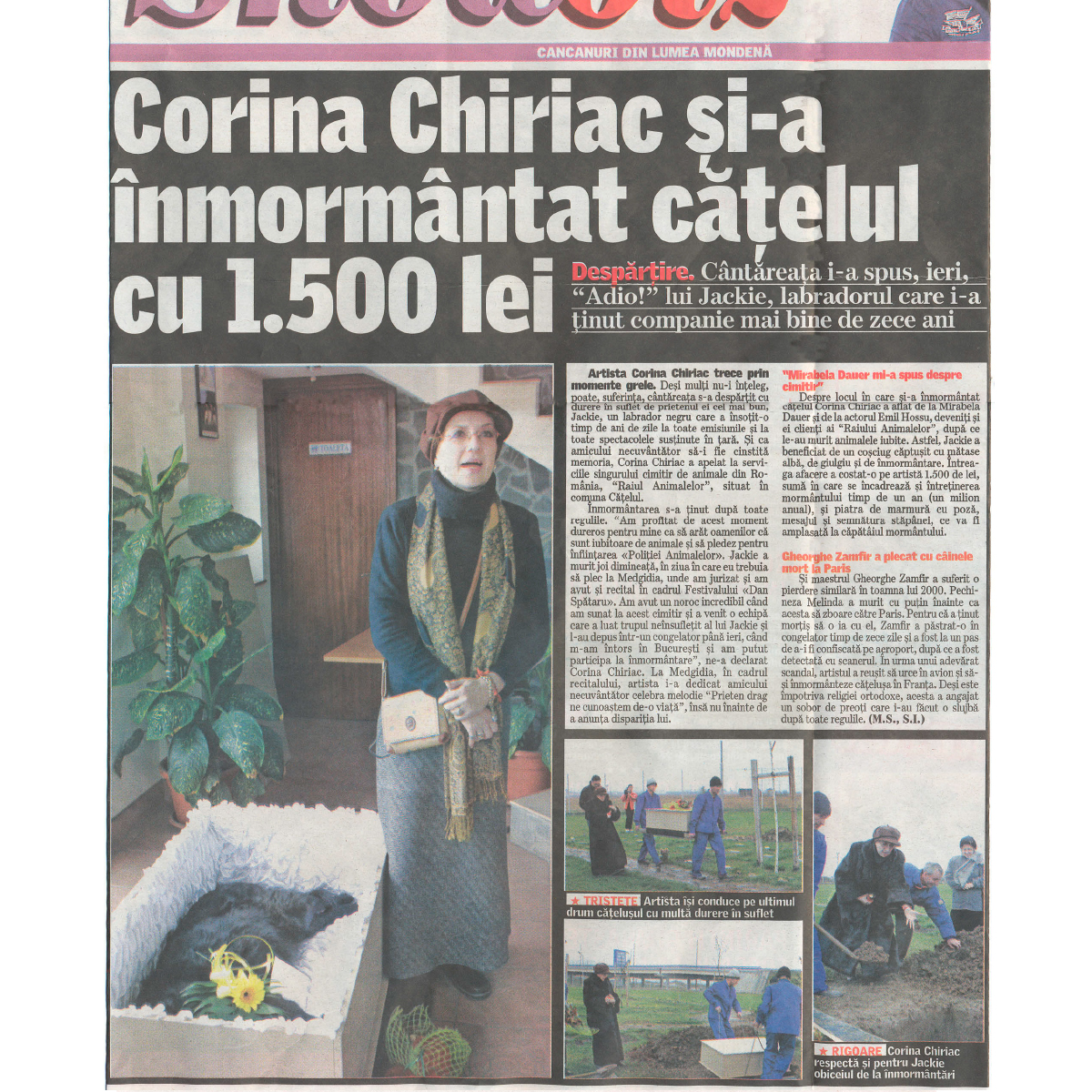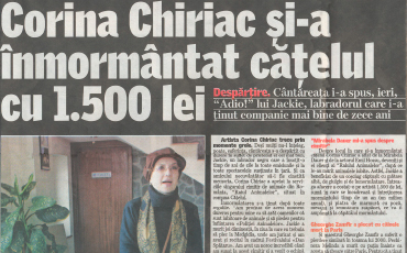"Artista isi conduce pe ultimul drum catelusul cu multa durere in suflet. Corina Chiriac respecta si pentru Jackie obiceiul de la inmormantari. Cantareata i-a spus, ieri, „Adio!” lui Jackie, labradorul care i-a tinut companie mai bine de zece ani Artista Corina Chiriac trece prin momente grele...