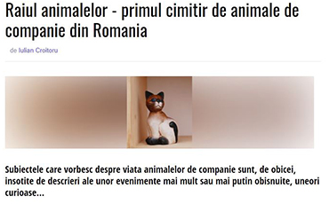 Articol "Animalul de companie între dragoste şi idolatrie"- Ziarul Lumina : "Undeva, la marginea Bucureştiului, în comuna Căţelu, pe strada Apusului, funcţionează "Raiul animalelor", primul şi unicul cimitir de necuvântătoare din România. Aici sunt înhumate aproape 3.000 de animale de companie şi incinerate aproximativ 900.."