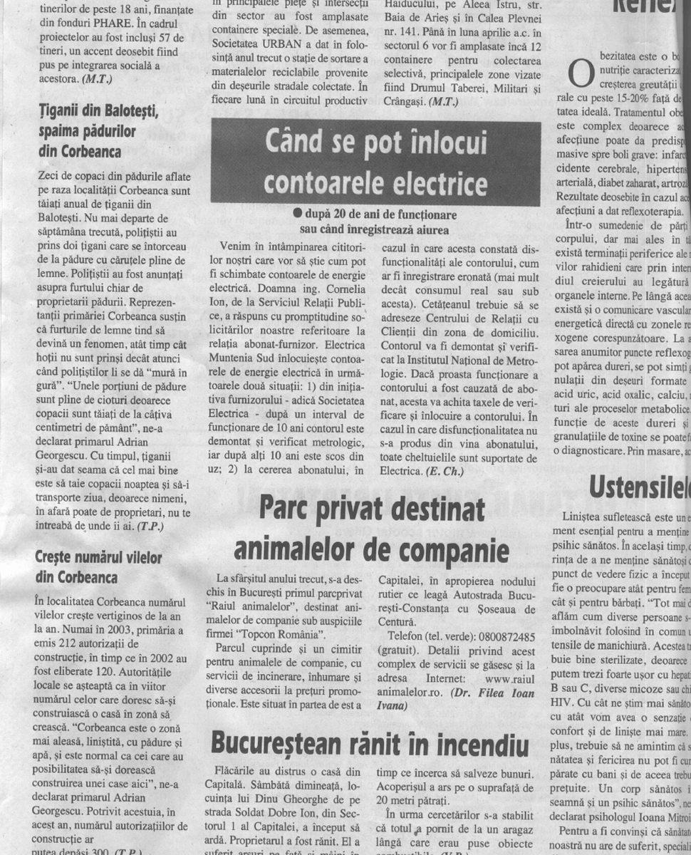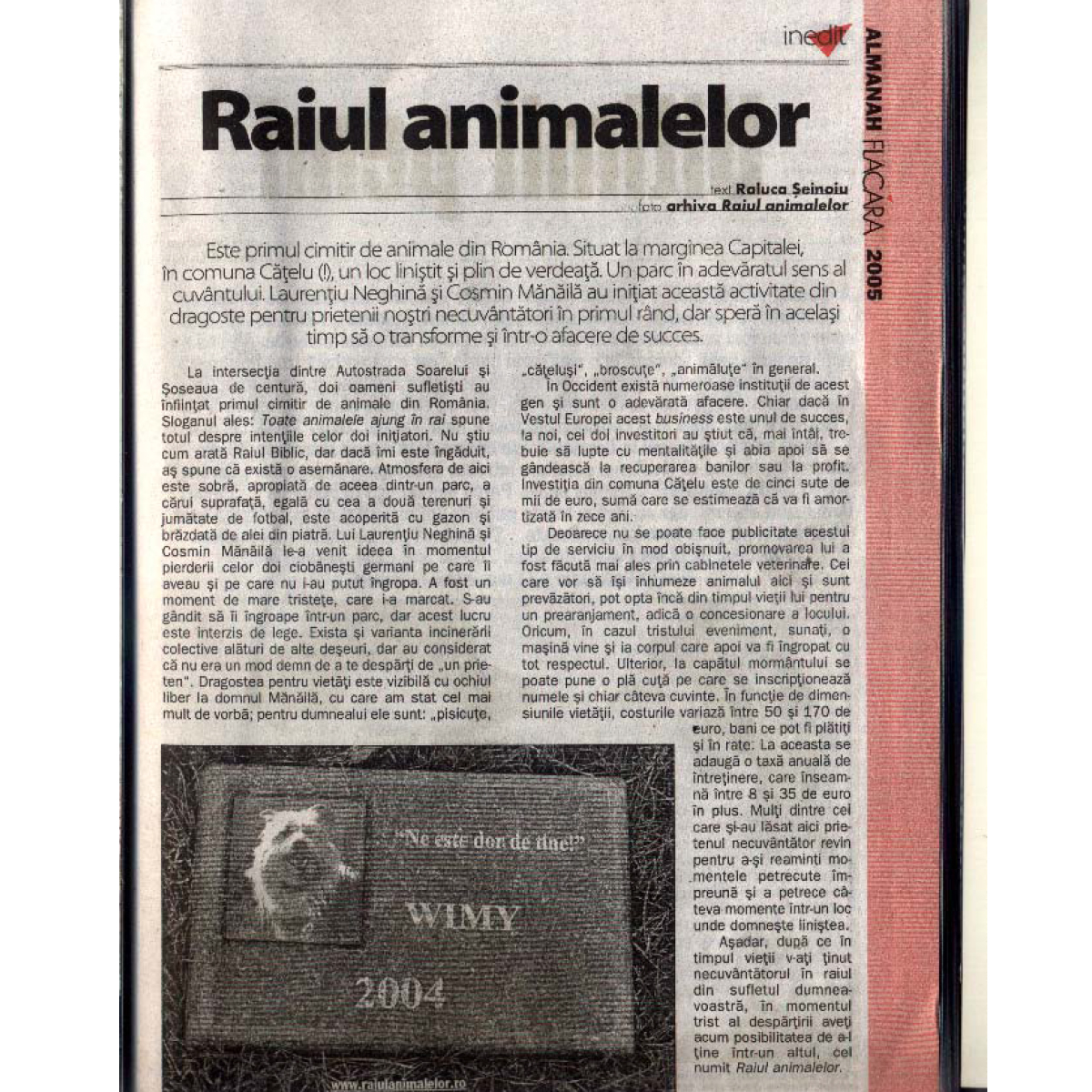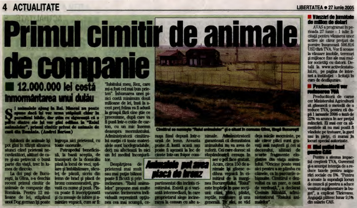 Este primul cimitir de animale din Romania. Situat la marginea Capitalei, in comuna Catelu, un loc linistit si plin de verdeata. Un parc in adevaratul sens al cuvantului.